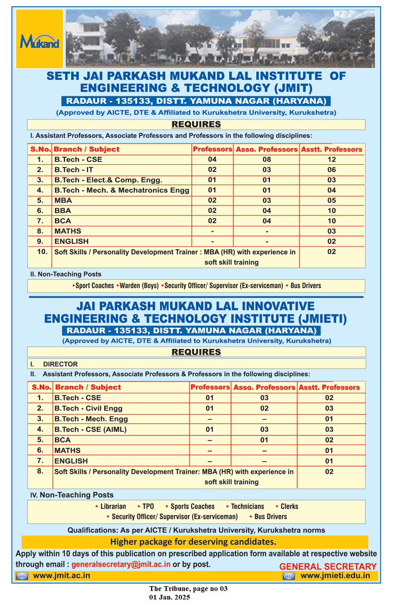 Admission to all courses in JMIT is in accordance with per All India Council for Technical Education (AICTE), Haryana State Technical Education society (HSTES) and KUK. Online counselling is being conducted by Department of Technical Education, Govt...