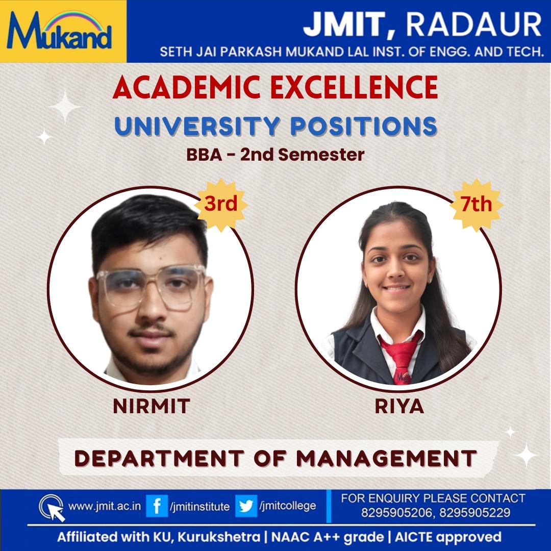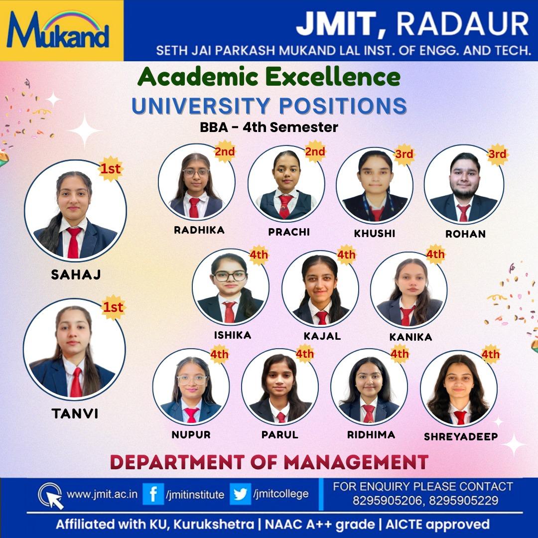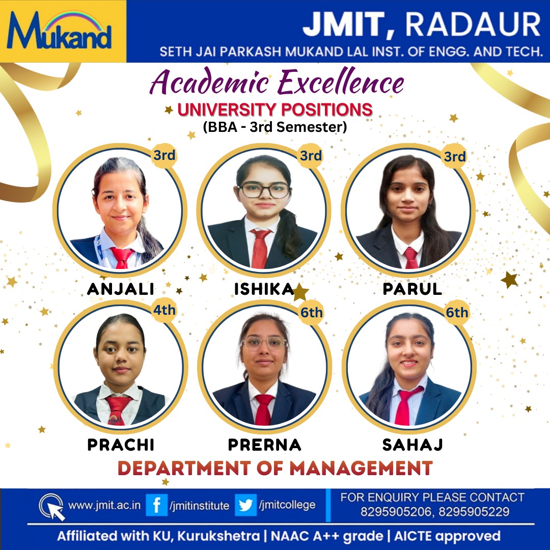BBA Program at JMIT aims even higher and go beyond the traditional approach of imparting an analytical framework to solve business problems. It is considered to be the steeping stone in the field of Business Administration. BBA is the most advanced stream of under graduation course based on the curriculum of Post graduate classes which offers ample opportunities for the students.